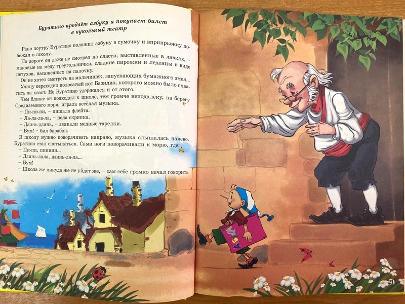 Сначала ребята услышали историю написания книги Алексея Толстого «Золотой ключик или Приключения Буратино», подержали её в руках, полистали страницы. Особый интерес у детей вызвали иллюстрации к разным изданиям книги, созданные художниками А. В. Кокориным, и И. Есауловым. Работы талантливых художников способны вызвать у читателей положительный эмоциональный настрой и эффект сопричастности.