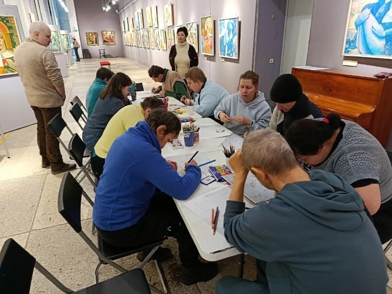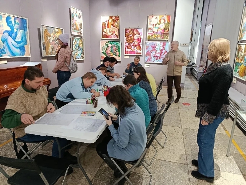 После просмотра картин, Илья Владимирович Кучерявый – научный сотрудник, реставратор, художник, провёл мастер-класс с нашими ребятами. Ксерокопии картин С. И. Лебедева были предложены для раскрашивания.