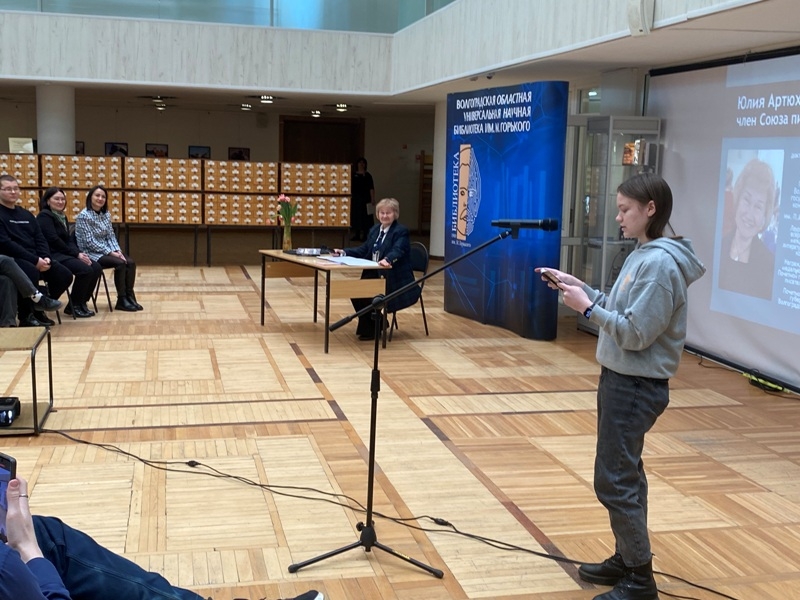 С читателями встретилась волгоградская писательница Юлия Артюхович – доктор философских наук, профессор, член Союза писателей России, обладатель золотой медали В. Шукшина, дважды лауреат литературной премии им. В.Б. Смирнова «Отчий край» и Государственной премии Волгоградской области, автор 10 научных монографий и 11 художественных книг стихов и прозы. Верба – её литературный псевдоним.