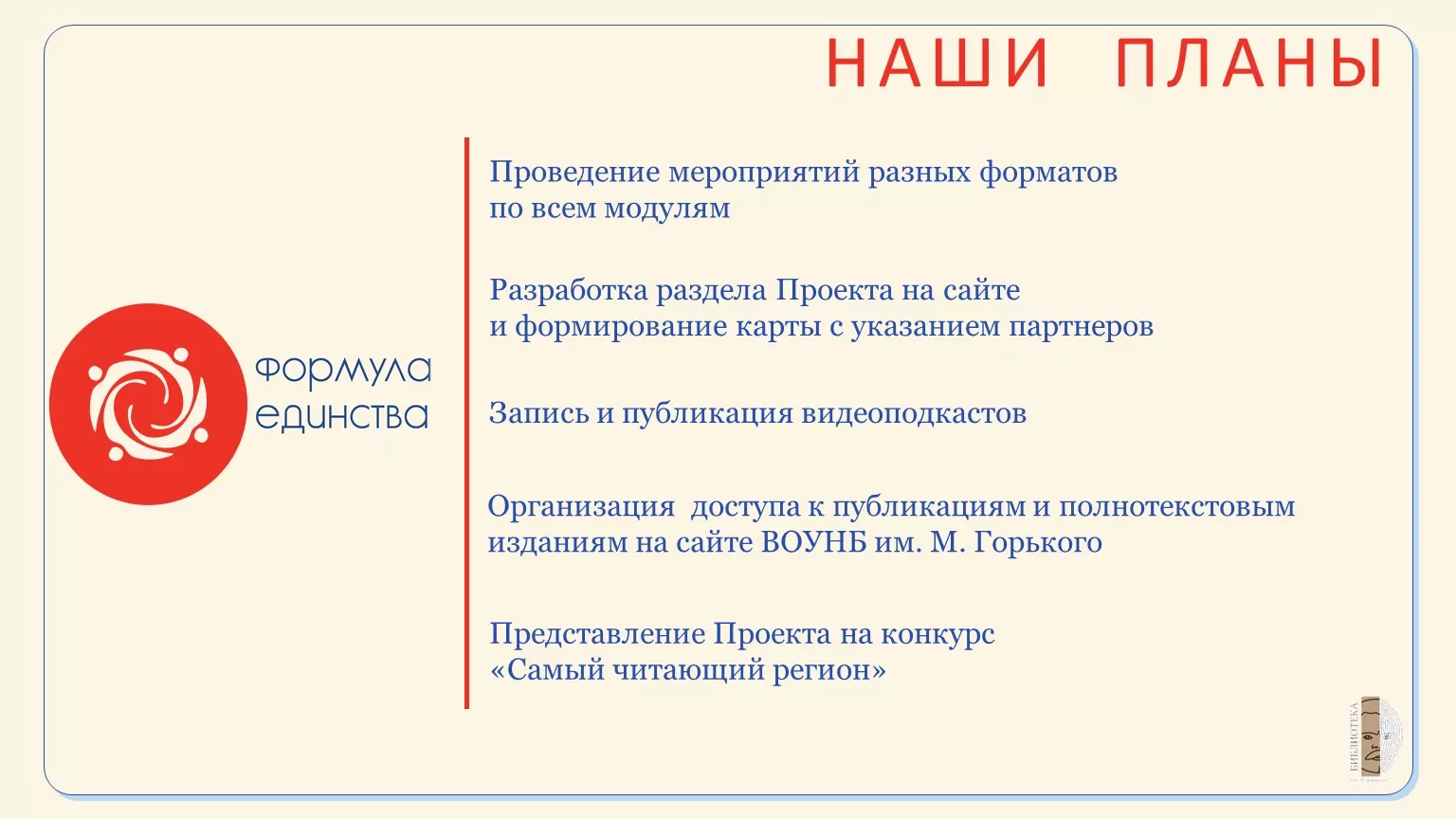План мероприятий, проводимых ГБУК «ВОУНБ им. М. Горького» в рамках проекта «Формула единства» в 2026 году
