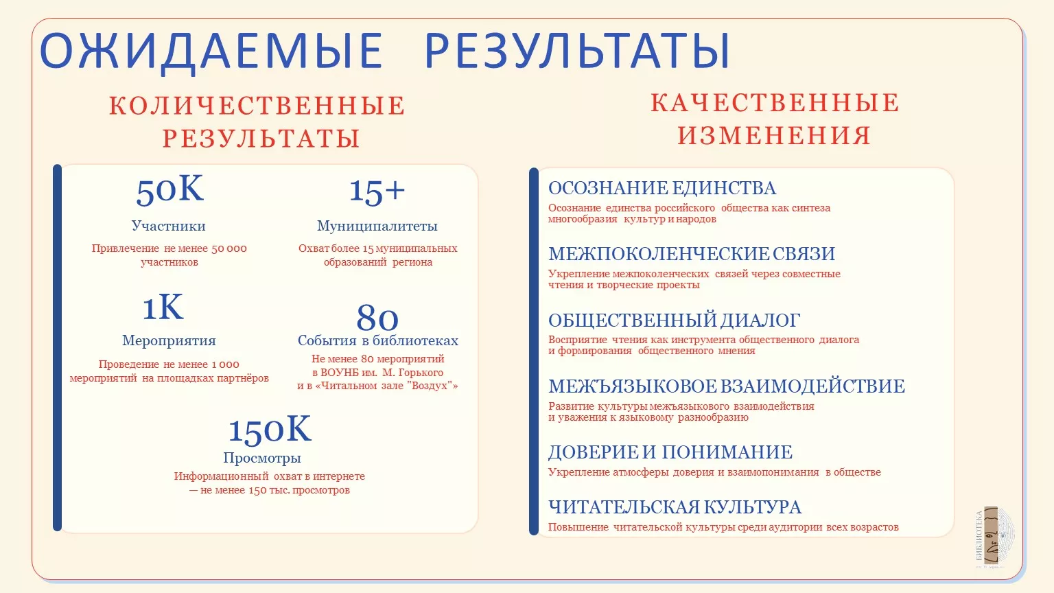 Проект нацелен на укрепление гражданской идентичности и социальной сплочённости через популяризацию чтения и культурные практики в Волгоградской области. В Год единства народов России (2026) он создаст пространство для диалога, совместного творчества и осмысления общих ценностей.