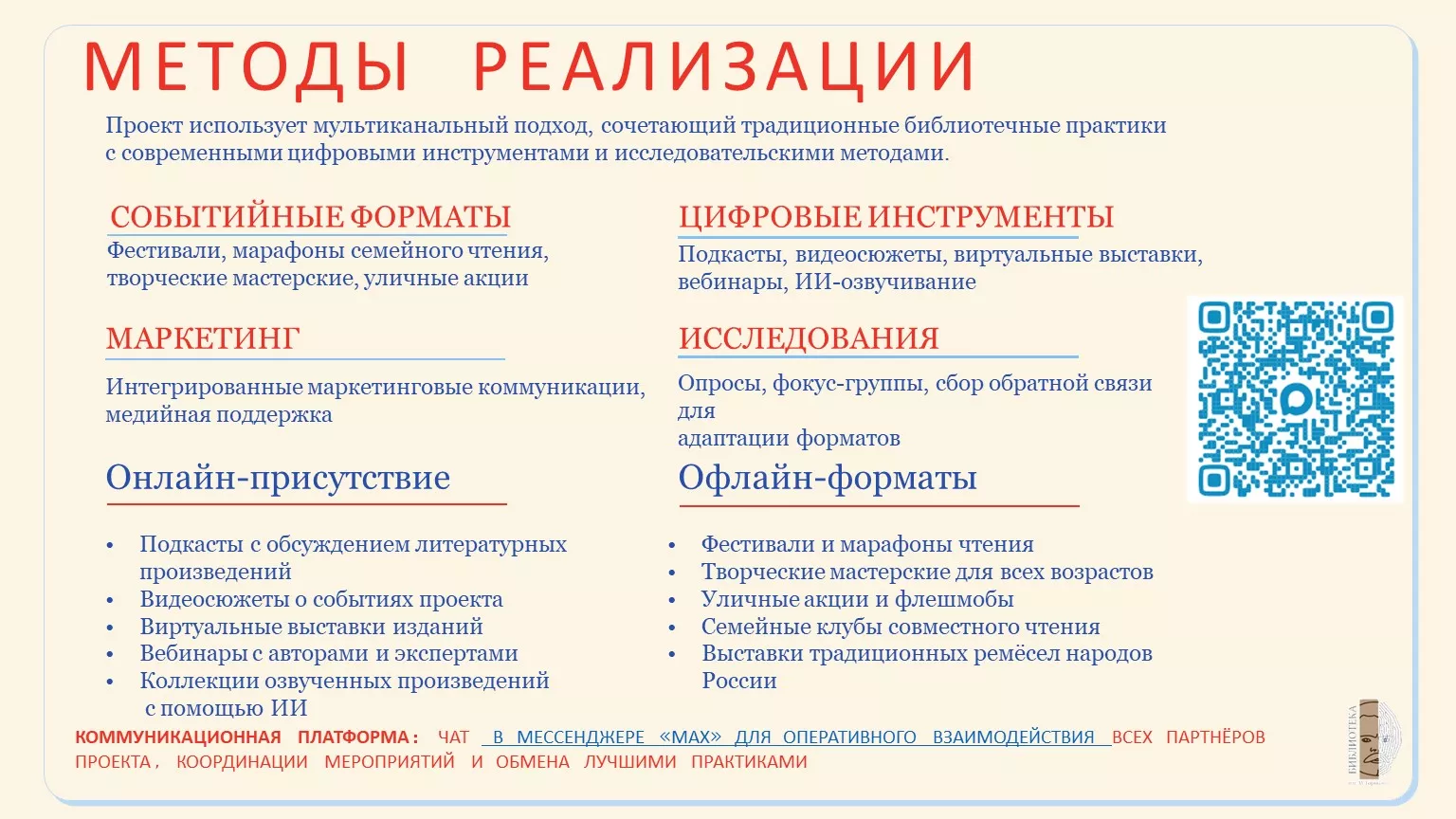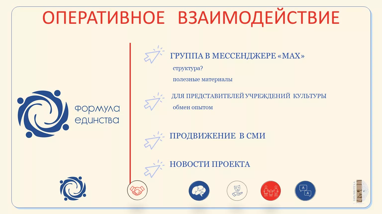 - «Семья — основа России» — программы, возрождающие традиции семейного чтения и совместного досуга, укрепляющие связь поколений.
