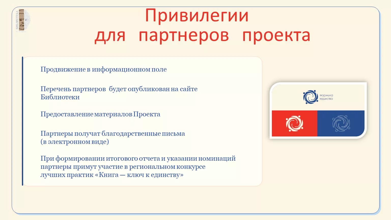 Региональный проект «Формула единства» логично продолжит успешные инициативы — «Книжный ЭМОВИРУС» и «Книжную одиссею», — которые показали высокие результаты и вошли в лонг‑листы лучших проектов по продвижению чтения в России Всероссийского конкурса «Самый читающий регион». В данной инициативе фокус сместится с управления эмоциями и воспитания чувств на формирование толерантного отношения к различиям во взглядах, культуре, традициях и образе жизни других людей и гордости за многонациональную страну.